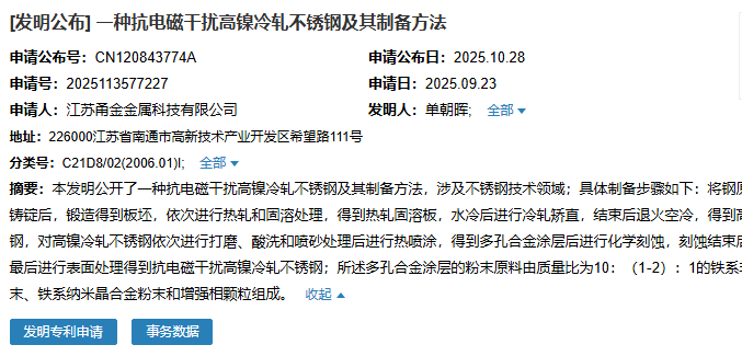 99979万彩网2025年10月28日,江苏甬金金属科技有限公司成功申请一项名为“一种抗电磁干扰高镍冷轧不锈钢及其制备方法”专利,申请公布号为CN120843774A,申请日期为2025年9月23日。