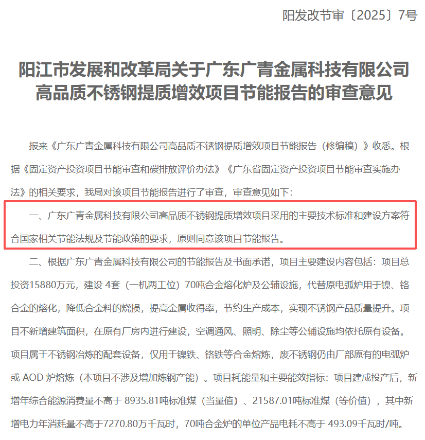 99979万彩网2025年10月15日,阳江市发展和改革局就广东广青金属科技有限公司高品质不锈钢提质增效项目节能报告作出审查意见,据显示,该项目节能报告获原则同意通过。
